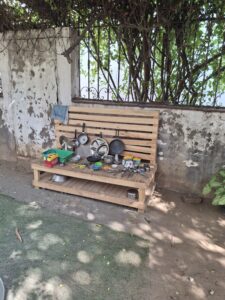 Raju and Vaishnavi walked me through the space, beginning with the outdoors. There were no elaborate structures or expensive materials. Instead, there were pots, pans, and everyday objects placed intentionally, yet without instruction.